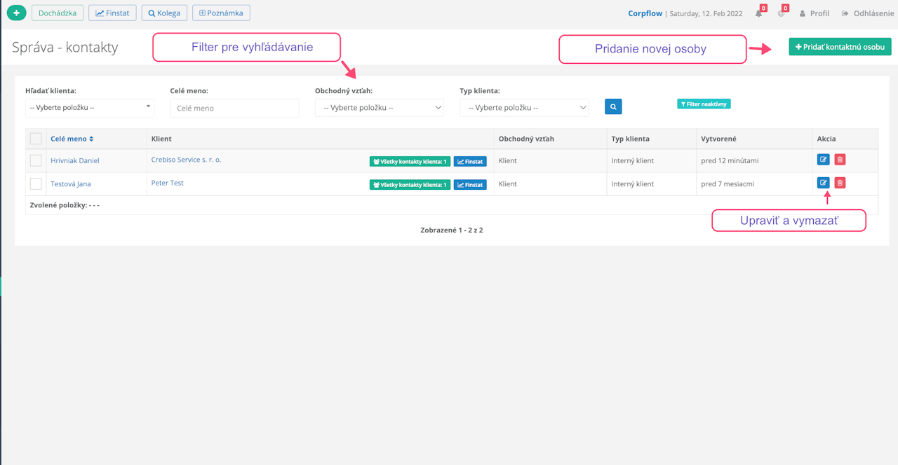 Tabuľka kontaktov - osôb priradených na partnerov / klientov.