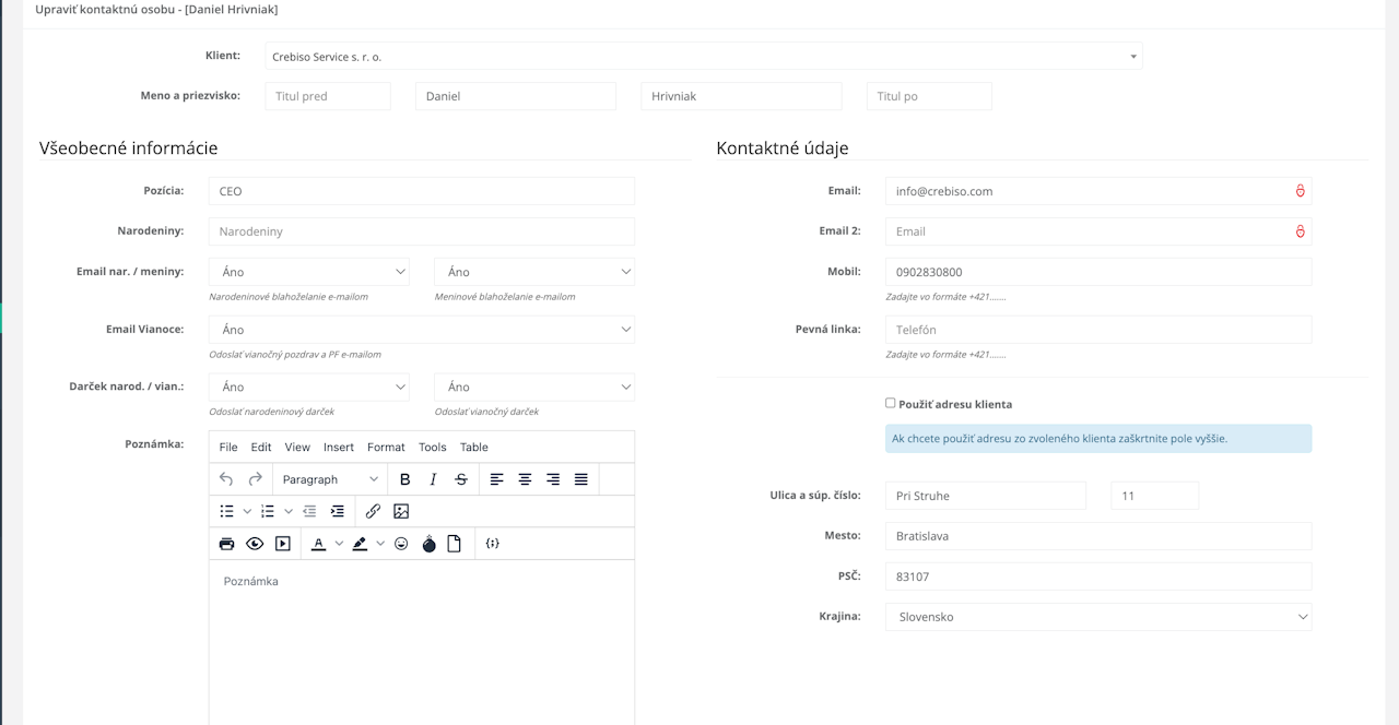 Vytvoreie / Úprava osoby: všeobecné informácie pre kontaktovanie a vytváranie databázy s potrebnými údajmi.
