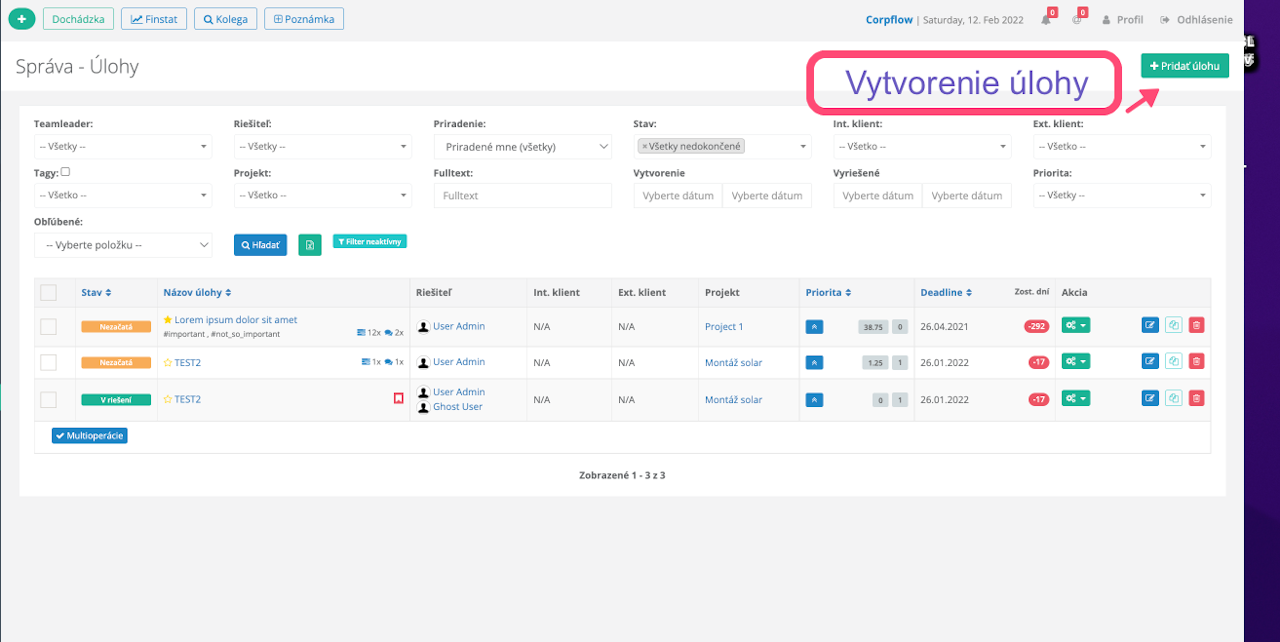 - zaevidovanie požiadavky do CF - Modul Úlohy (na strane klienta) // vyplnite prosím názov, základný popis kde vložíte "link chyby", príloha (vložte prosím screen obrazovky alebo krátie video), určite prioritu, deadline (odhadovaný / požadovaný), vyberte neprojektová úloha -- > klient)