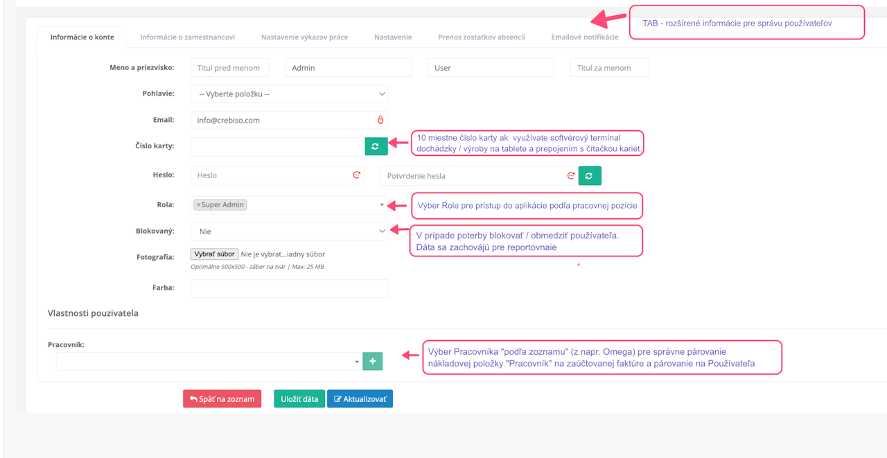 - Upraviť: Priradenie projektov, Upraviť základné hodnoty Absencií, Nastaviť podriadených, Generovať kartu (Kód) pre vstup /podľa konfigurácie
