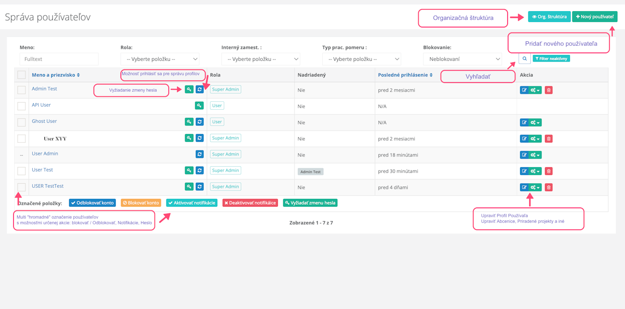 - Filtrovať (podľa: Meno, Rola, Interná firma, Typ prac.pomeru, Blokovanie)