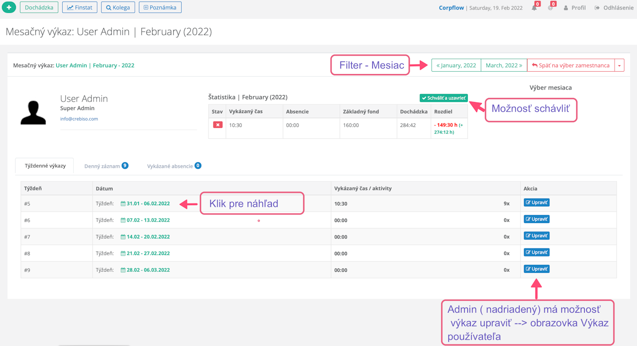 - Ak je ptrebné zmeniť hodnoty vo výkaze --> Detail Používateľa --> jednotlivé týždne --> Upraviť.