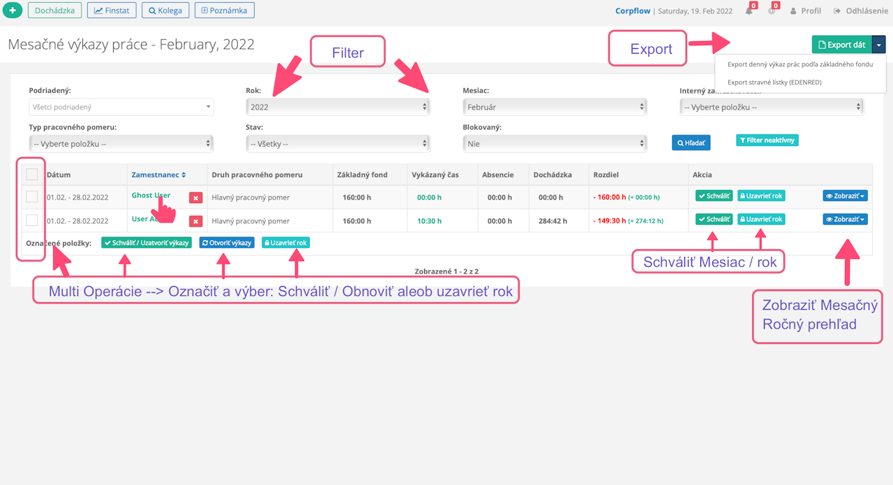 - Je možné využiť: Multi Operácie a označiť viacerých --> označiť --> a pod zoznamom je "zelené tlačidlo" Schváliť výkazy.